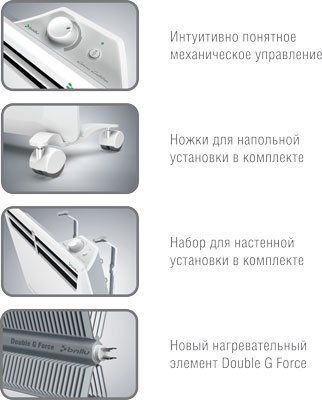 Мощность: 1500 / 750 Вт. Площадь обогрева: 8 - 20 кв.м. Установка: напольная. Механический термостат.