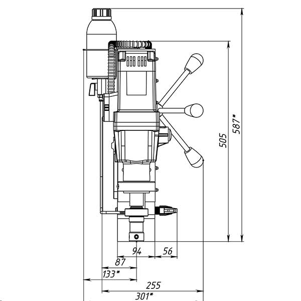Предназначен для промышленного использования, сверления большого количества отверстий диаметром до 100 мм., также будет надежен при использовании спиральных сверл диаметром до 32 мм. Нарезка глухой резьбы возможна без специальных резьбонарезных патронов. Подвижное основание относительно магнита. Это станок с подвижным магнитным основанием, то есть при активированном электромагните возможно разъединить жесткую связь станины с магнитом и отрегулировать положение центра сверла, потом снова жестко закрепить станок поворотом рукоятки. Эта функция весьма полезна при сверлении вертикальных поверхностей, потому что трудно с первой попытки попасть довольно тяжелым магнитым станком в центр будущего отверстия. На магнитных станках зарубежных производителей такая функция называется "магнитное основание с юстировкой".