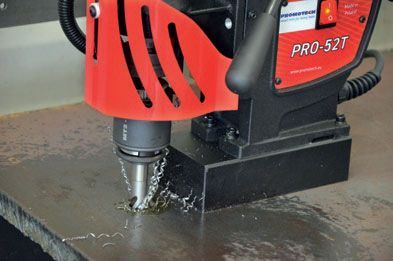 Универсальная сверлильная машина PRO 52T предназначена для выполнения отверстий диаметром до 50 мм кольцевыми фрезами. Машина дает возможность изменения направления вращения шпинделя для нарезания резьбы, а также позволяет работать спиральными сверлами и зенкерами.