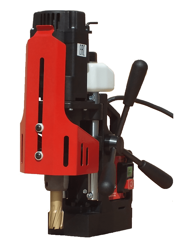 Минимальная высота магнитного станка всего 306 мм и вес не более 10 кг позволяет выполнять работы в местах с ограниченным пространством. Максимальная составляет 376 мм. Имеет интегрированную систему подачи СОЖ (смазочно-охлаждающая жидкость) в стандартной комплектации, обеспечивая при этом высокую безопасность. Характеризуется надлежащей надежностью и простотой в обслуживании. Основной рабочий инструмент сверлильной машины - корончатые сверла.