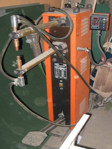 Машина состоит из вертикально расположенного корпуса, в котором установлен силовой блок, блок управления и система ножного педального привода сварочных электродов. Система привода оснащена регулятором усилия сжатия электродов, датчиком автоматической синхронизации момента оптимального сжатия и включения сварочного тока.