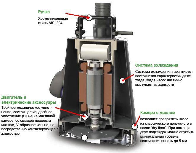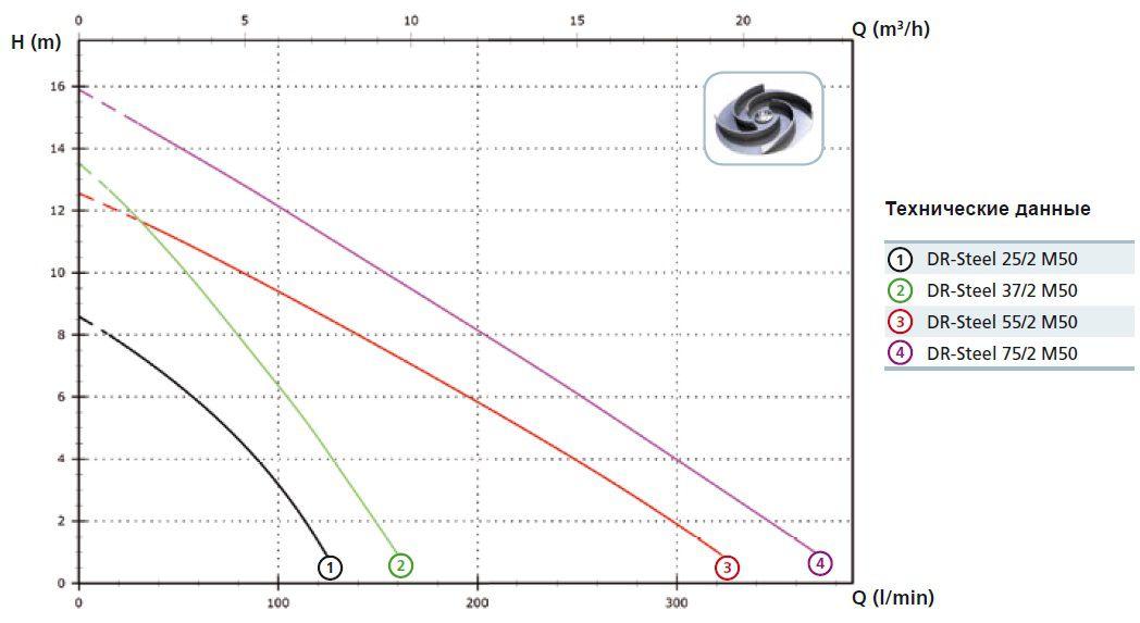 Насосные агрегаты типа DR-Steel - погружные с вертикальным подающим патрубком. Проточная часть насоса, рабочие колеса выполнены из нержавеющей стали; имеют водяное охлаждение двигателя.