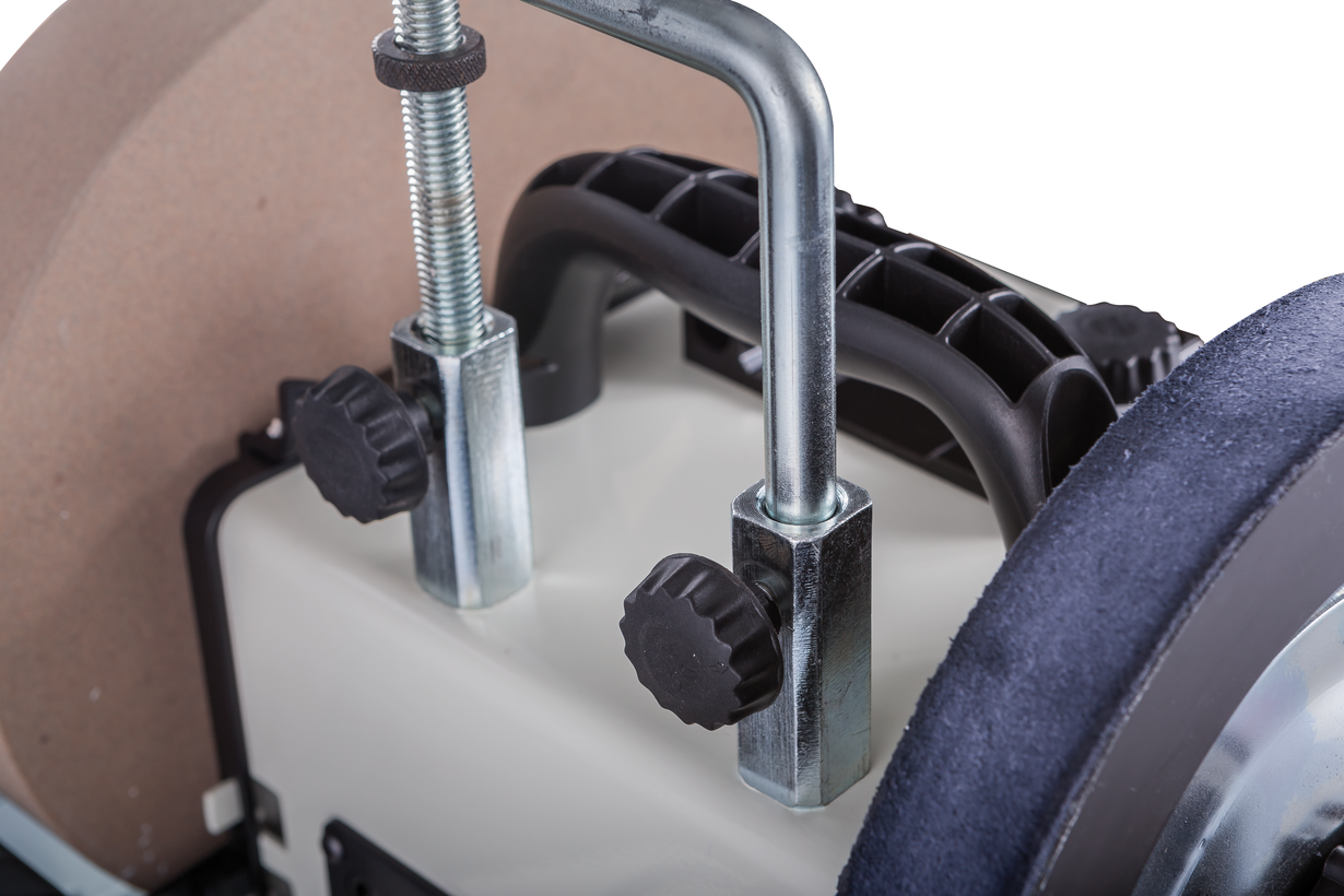 Jet JSSG-10 - шлифовально-полировальный станок для заточки, правки и доводки режущего инструмента (в основном ручного) с высокой точностью и без отпуска режущей кромки. Вал с кругами (абразивным, шлифовальным и кожаным полировальным) вращается с небольшой скоростью, которую можно регулировать при помощи рукоятки на передней панели станка. Шлифовальный камень погружен в ванну для смачивания водой.