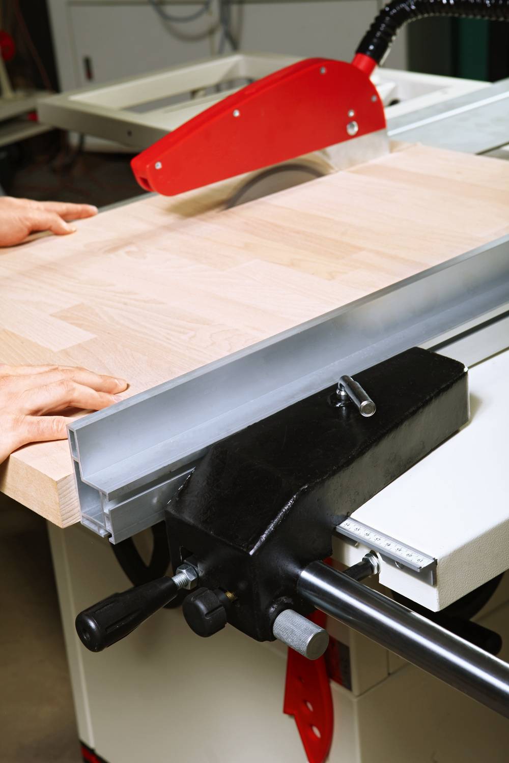 Основа конструкции пилы – металлическая тумба, внутри которой установлены асинхронный трехфазный двигатель, механизмы регулировки по высоте и углу наклона пильного модуля (он выполнен из чугунной отливки) и пылесборный кожух со 100-миллиметровым патрубком подключения к вытяжной установке. Рабочий стол чугунный, вдоль него проходит жесткая цилиндрическая направляющая, по которой перемещается параллельный упор с эксцентриковой фиксацией – эти решения полностью соответствуют профессиональному стандарту. Рабочая поверхность может быть увеличена за счет установки расширителя и удлинителя, сделанных из листовой стали – они штатно поставляются вместе с пилой.