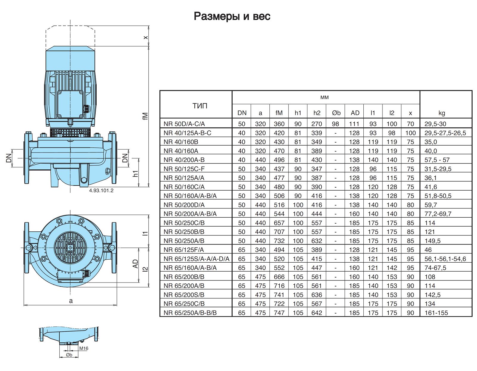 Насосные агрегаты NR4 - центробежные с одним рабочим колесом типа "IN - LINE" с четырехполюсным электродвигателем (n = 1450 об./мин.). Проточная часть насоса и присоединительные фланцы выполнены из чугуна; рабочее колесо - из латуни.