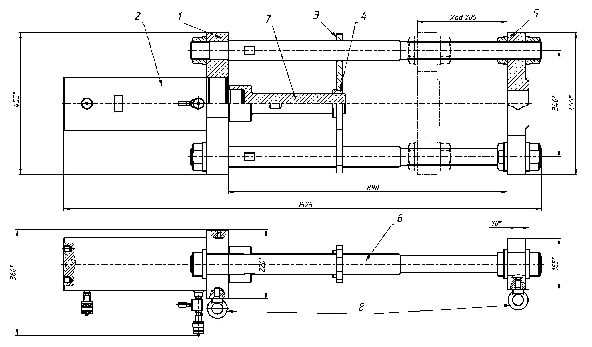 Основными составными частями выпрессовщика являются: траверса (1), в которой закреплен домкрат ДУ50П150 (2); пластина направляющая (3), в которой установлена втулка направляющая (4); пластина опорная (5), в которой установлена втулка опорная (6), две шпильки (7), которые установлены в продольных пазах траверсы (1) и пластин (3) и (5). На шток домкрата (2) устанавливаются сменные пальцы (8) (один большой и два малых). Для установки выпрессовщика на рабочем месте предусмотрены рым-болты (9).